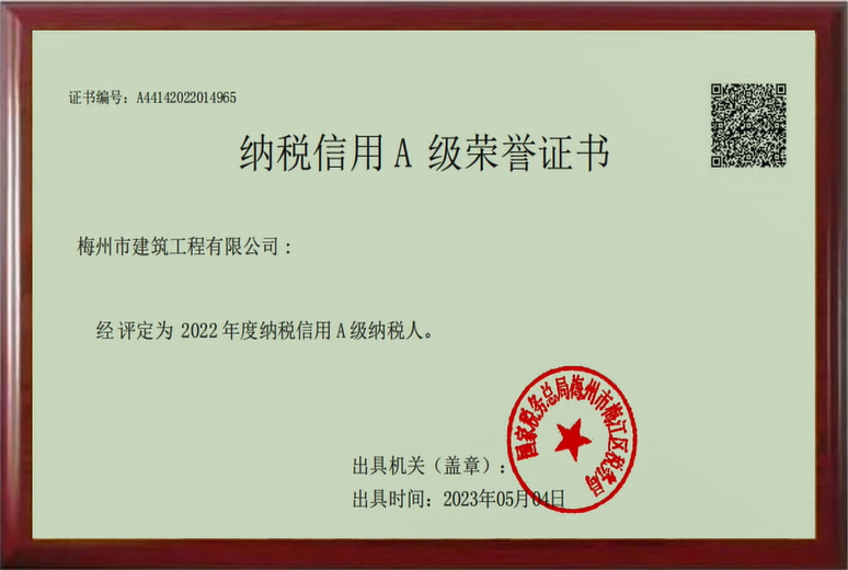 納稅信用A級榮譽證書